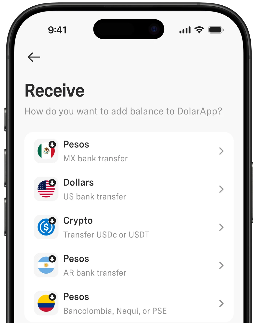 *Transfers received in MXN, COP, USD and EUR will automatically be converted to digital dollars or digital euros.